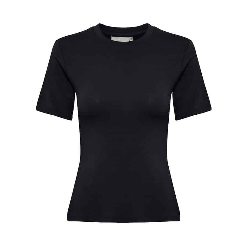 En enkel T-skjorte laget i et mykt og stretchy modal jerseystoff. Den har rund hals og korte ermer som er kuttet på midten av overarmen. T-skjorten har en slim fit og er kuttet midt på hoftene.