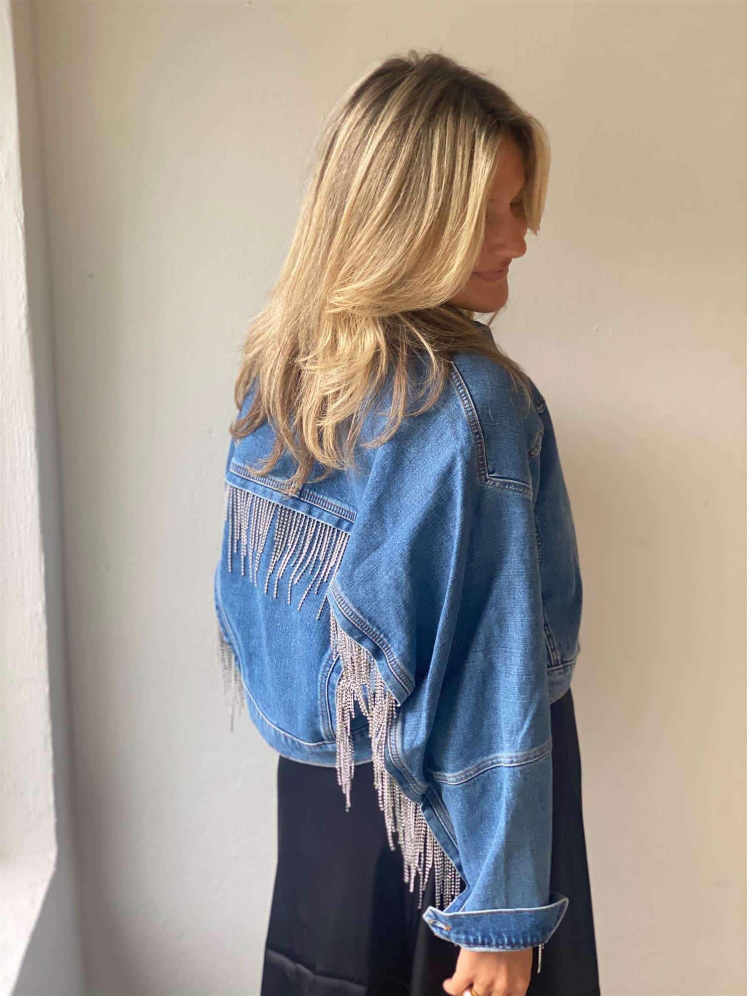 Denimjakke designet med vakre westerninspirerte glitrende frynser på ermene og ryggen. Jakken har lommer, overdimensjonerte løse ermer og er laget av økologisk bomull.