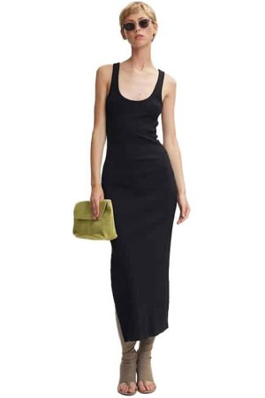 Beskrivelse – maxikjole i mykt ribbestrikket stoff. Kjolen har rund hals og er uten erme. Den kommer ned til anklene