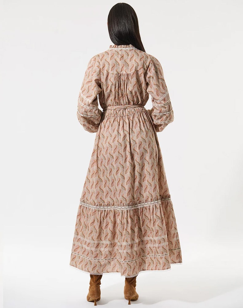 Denne full lengde kjolen med normal passform med volum ermer og et utsvingt, lagdelt skjørt trekkes i form i midjen med et knytebelte. Den høye kragen, ermene og skjørtet er dekorert med blondetape og volanger for å legge til ekstra delikate detaljer, og stoffet er en myk bomullsvoile med paisley-trykk.