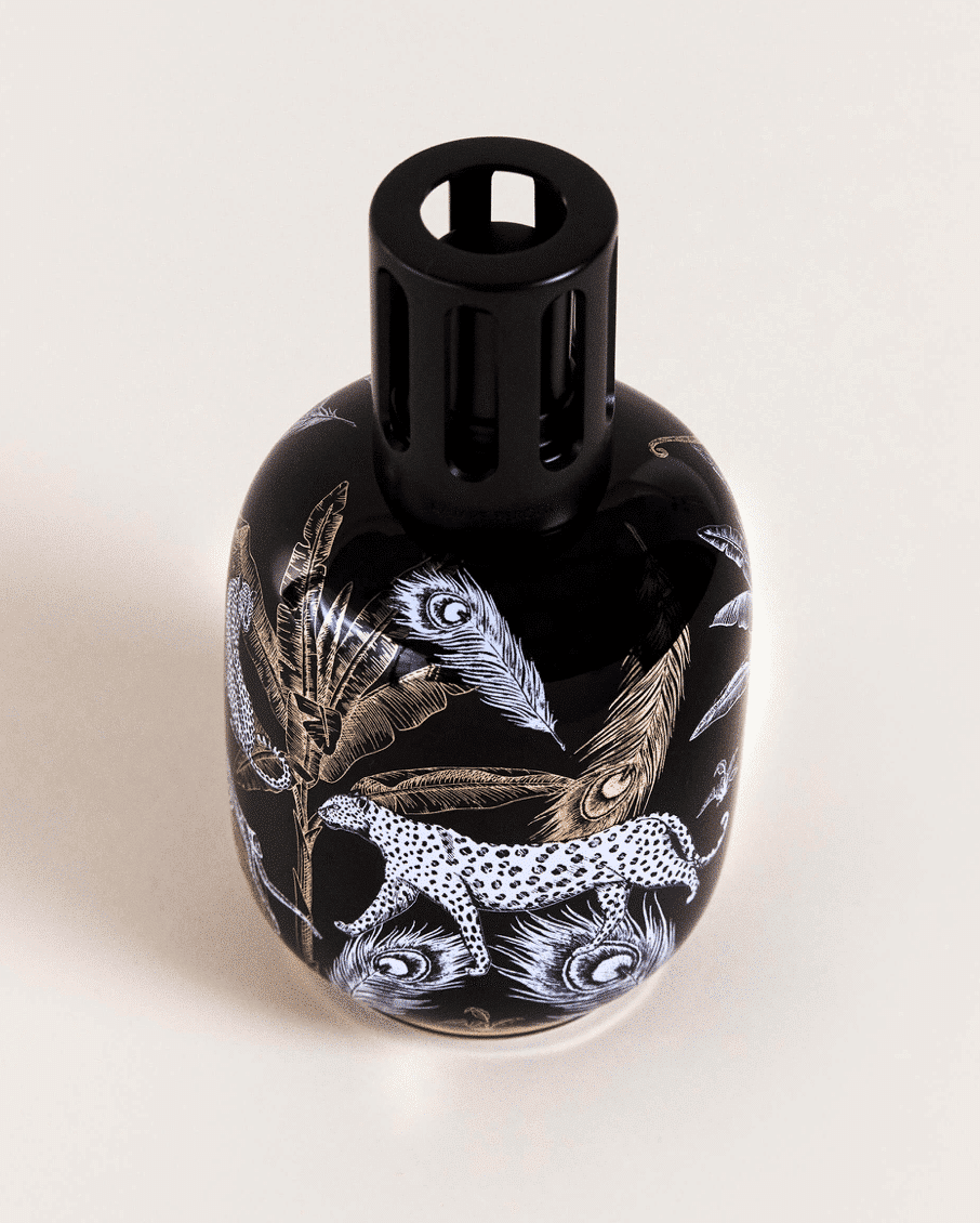 Omgi deg selv med utemmet skjønnhet og unn deg kjærligheten til sterke mønstre med den dristige svarte jungellampen! Lampen er laget i porselen og er eksotisk og raffinert, med et mønstret svart emaljebelegg og utsøkt hvitt og gullmønster.