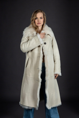 Nydelig saueskinnsjakke fra Møller. Jakken kan vrenges og brukes begge sider. Jakke i trigado lam Beige / Hvit