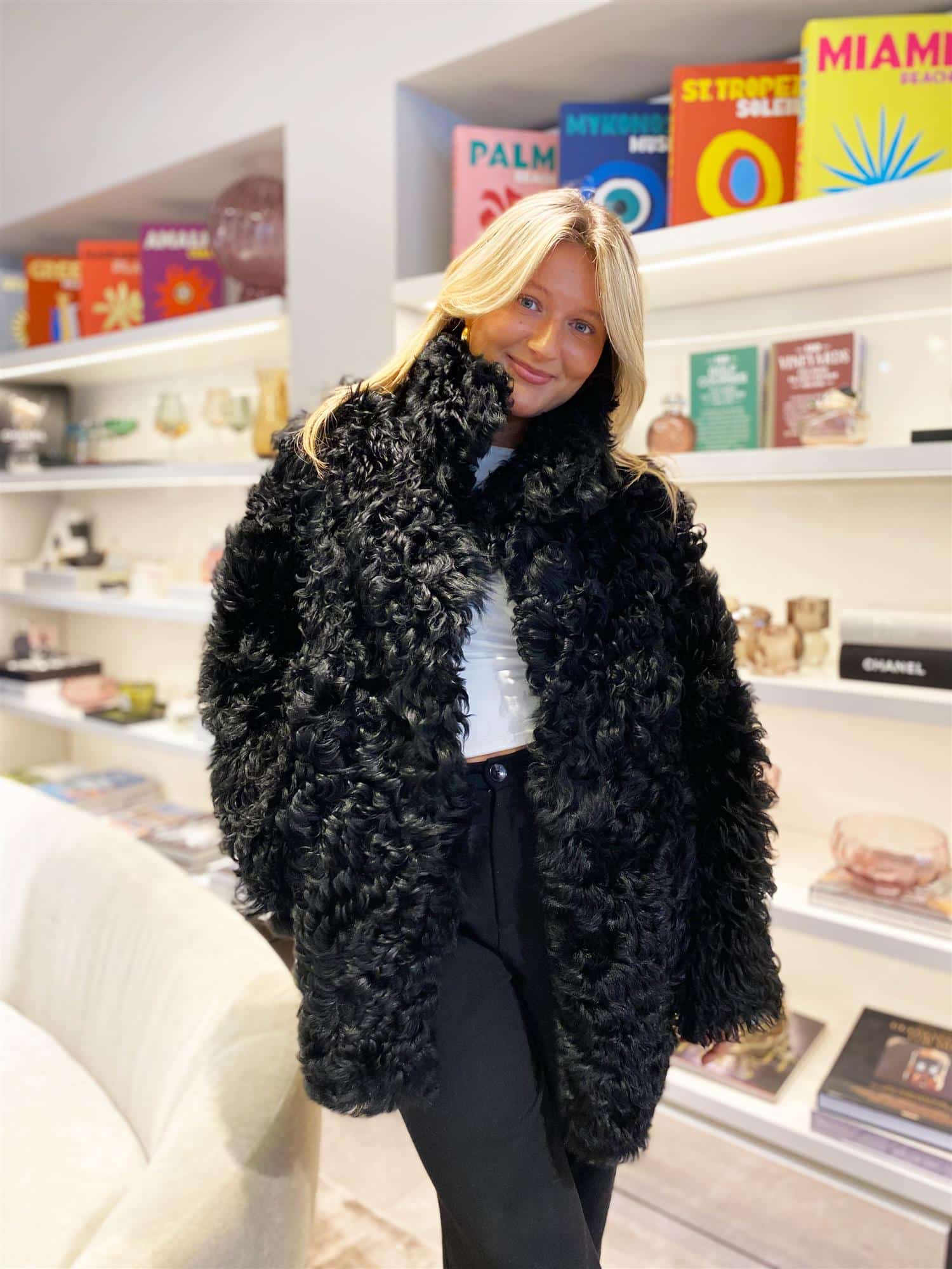 Christian Aks Keyla Jakke laget av en myk lammeull. Et rent og tidløst design med frynser nederst. Interiør ferdig med