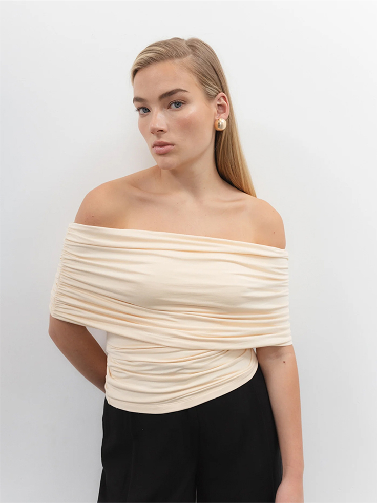 VIVEH Dosinia-toppen har samme passform som vår bestselger Giada, men er laget i et mykere og mer elastisk stoff. Den rynkesydde, off-shoulder-utformingen skaper en vakker omslagseffekt over brystet, noe som gjør den til den perfekte kveldstoppen.