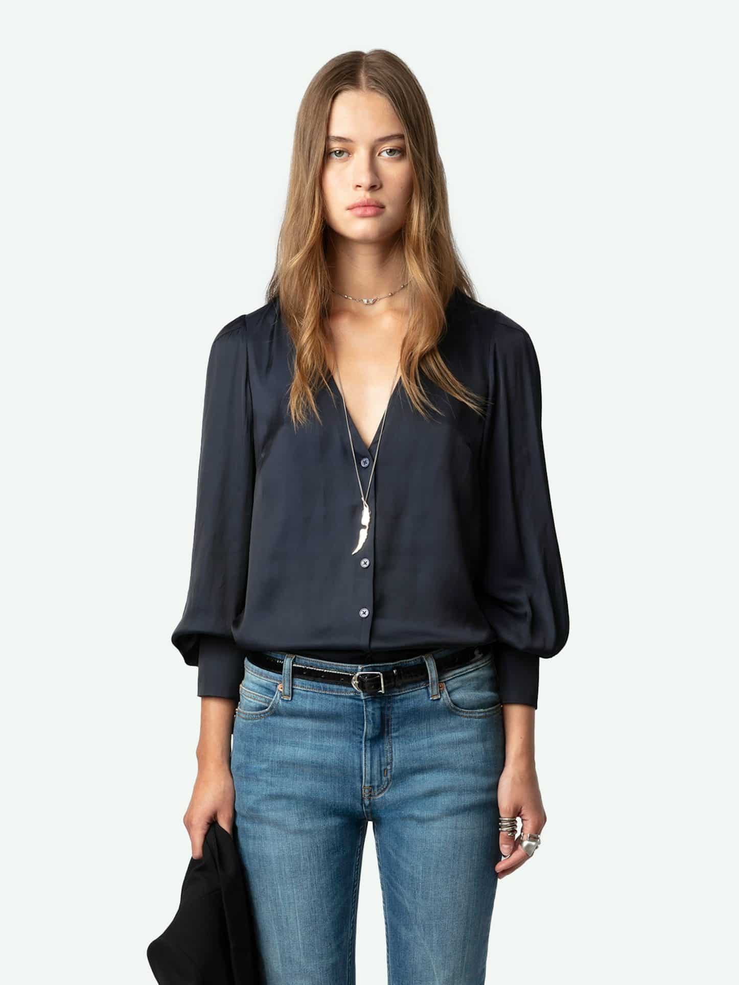 – Encre blå satengskjorte for kvinner