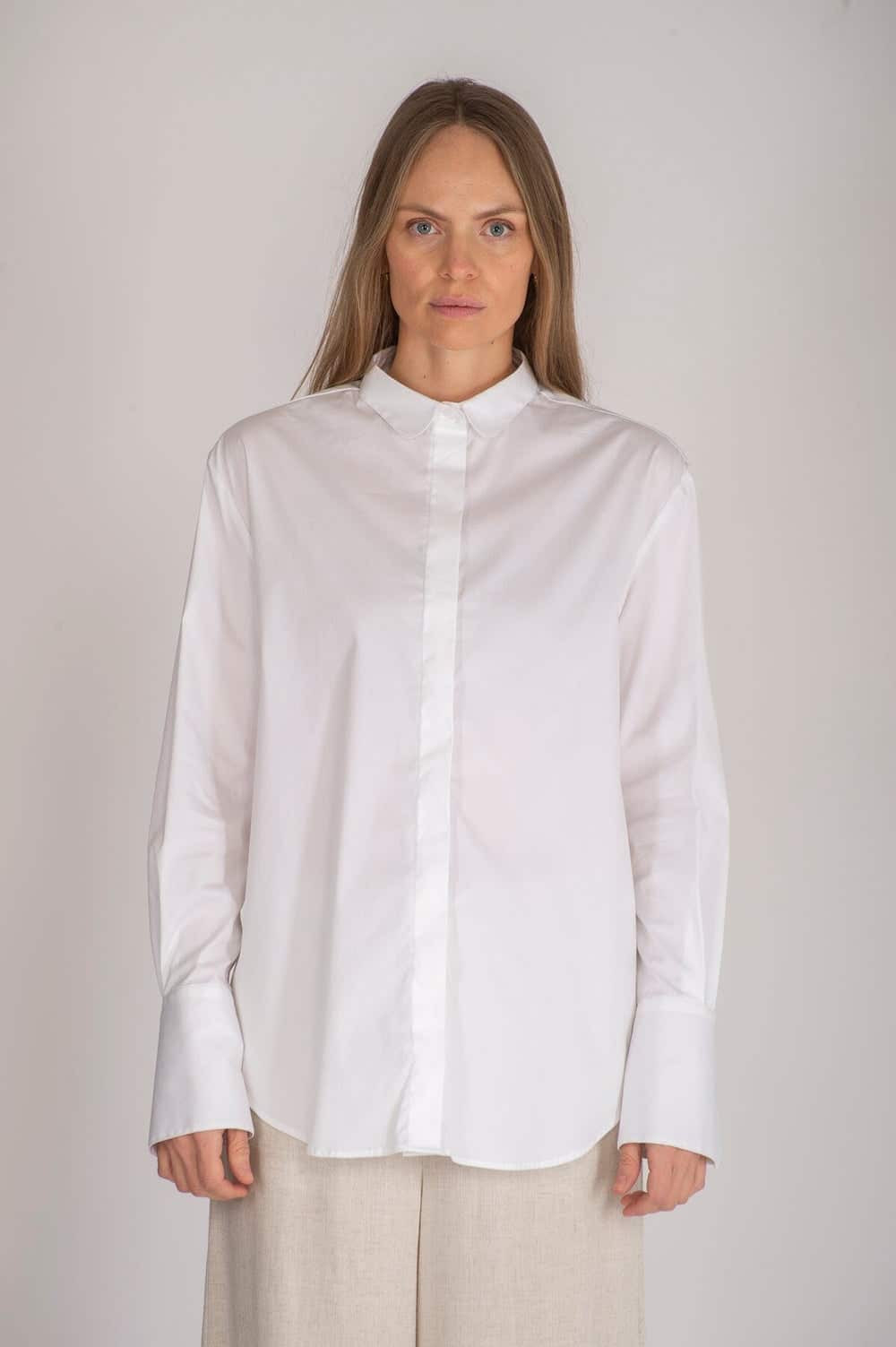 – Oversized bomullsbluse – Kozak-broderier – Rund krage med knapp – Samlede detaljer og folder bak – Lange ermer og