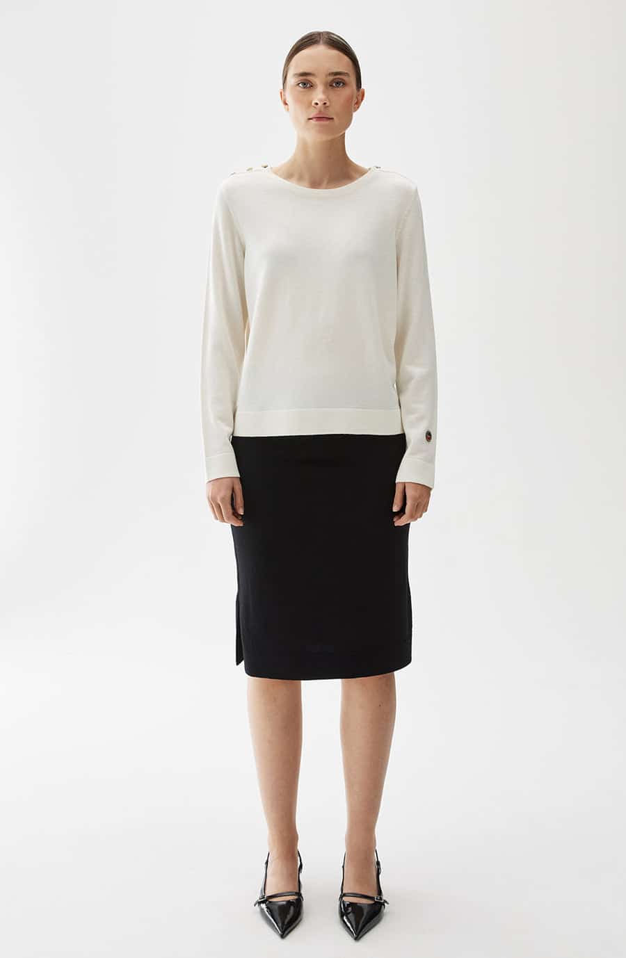 Annika Top er en strikket langermet topp i mykeste merinoullkvalitet. De gylne B-knappene på skuldrene skaper den lille ekstra luksuriøse
