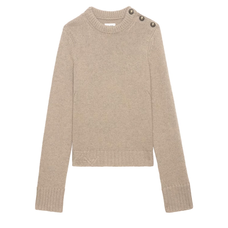 Langermet ecru genser i 100 % kashmir med trakthals og mansjetter med knapper med diamant-stjernejuveler. – Flake ecru genser i