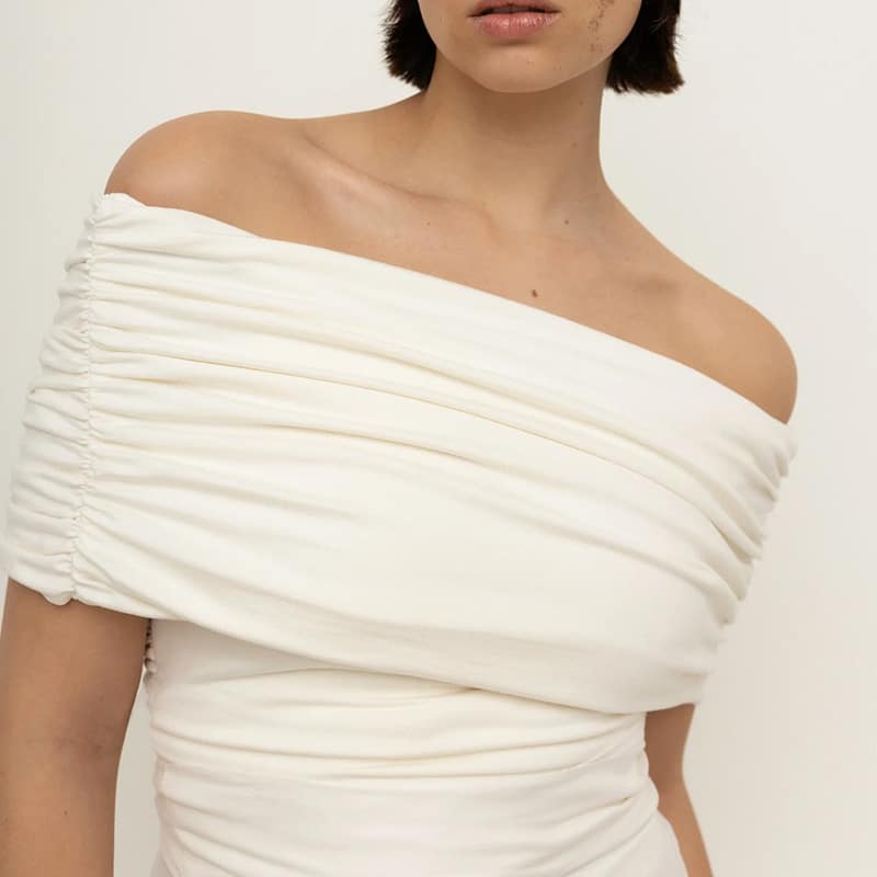 VIVEH Giada har et rynket, off-the-skulder snitt som skaper en vakker omslag over brystet, noe som gjør den til den perfekte kveldstoppen som også kan styles for dagen. Laget av vår signatur ECOVERO™ viskosejersey-stoff, den bæres stramt og klemmer kroppen elegant. Giadaen kan vendes og gir deg muligheten til to forskjellige utringninger. Kroppen er dobbeltfôret for ekstra støtte.