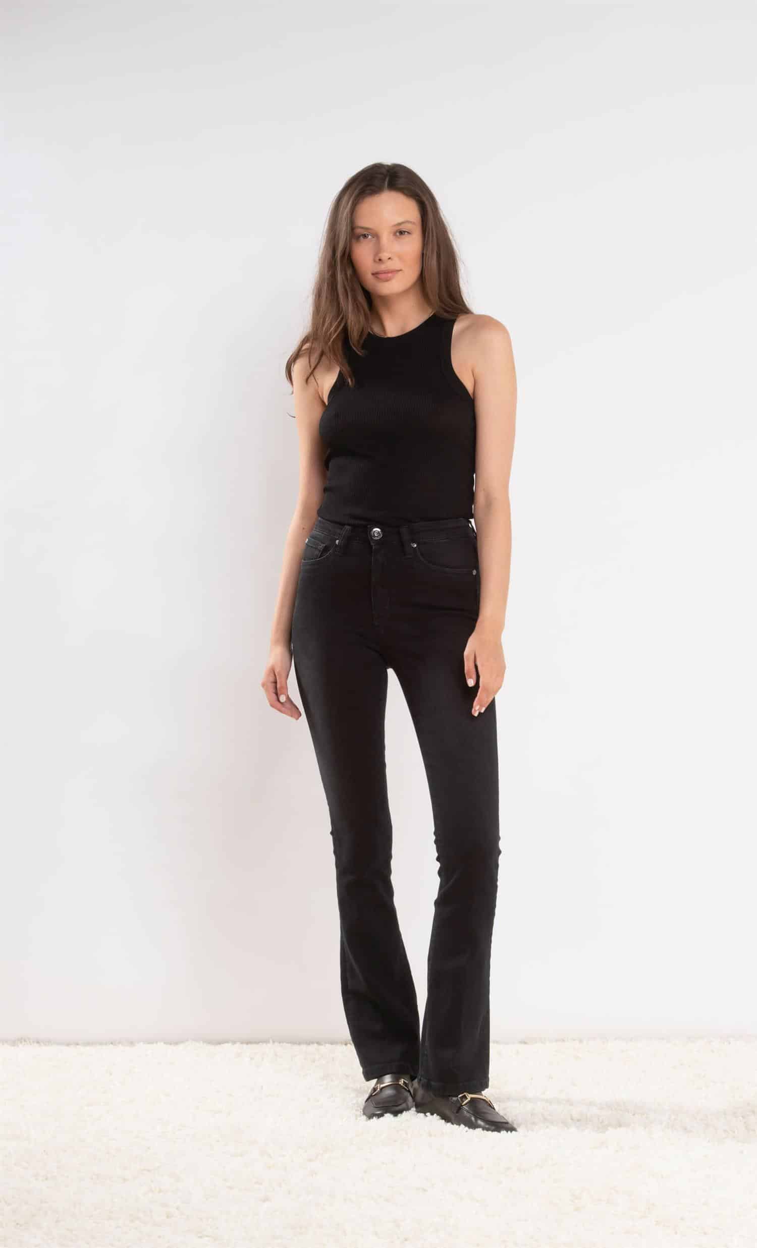 Flare bukser, høy midje, 23 cm bunn, lengde 32″ (81 cm). Tilgjengelig i 34 tommer.