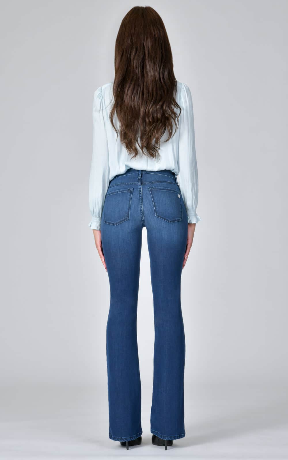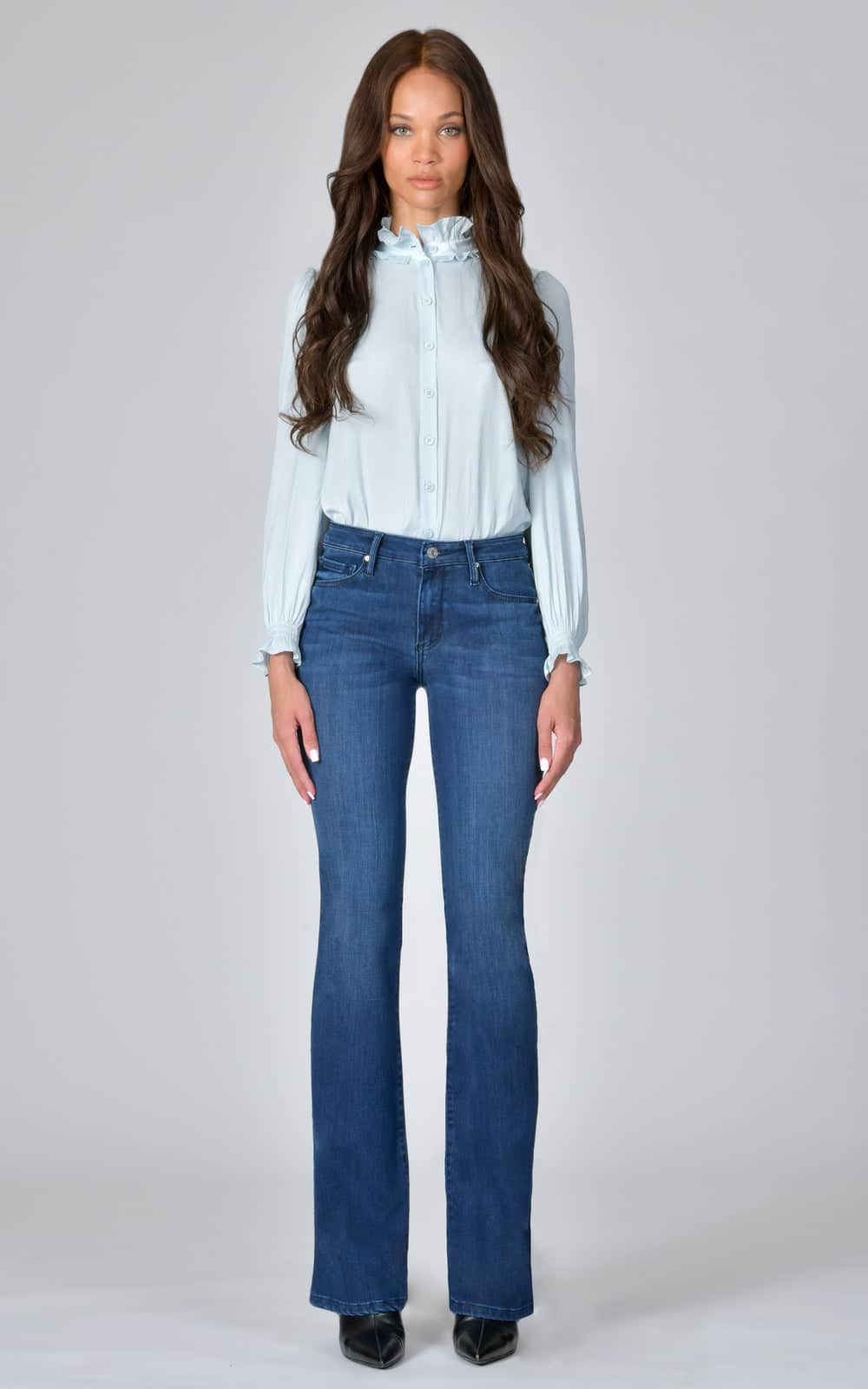 Flare bukser, høy midje, 23 cm bunn, lengde 32″ (81 cm). Tilgjengelig i 34 tommer. modellen er 171 cm høy