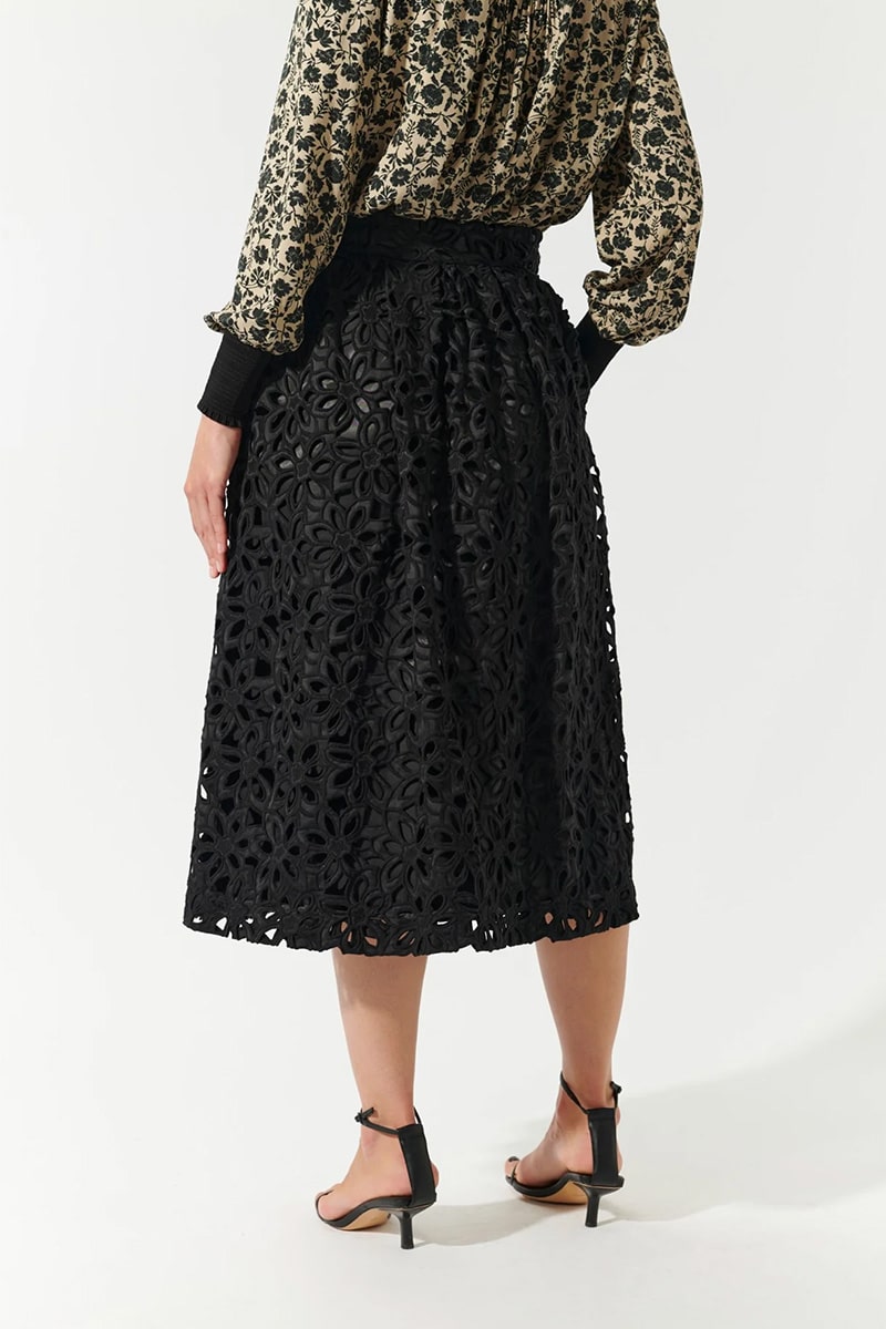Elegant nok for kvelden, komfortabel nok til en avslappet stil: Denne fullstendige dirndl-formede skjørtet i oversized svart broderie anglais er perfekt for sommerfester. Skjørtet er helfôret, har sidelommer, rekker til midt på leggen og passer like godt med en blazer, skjorte eller den matchende bandeau-toppen.